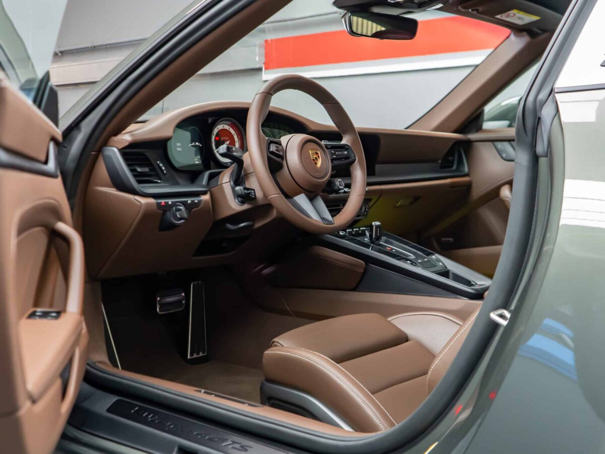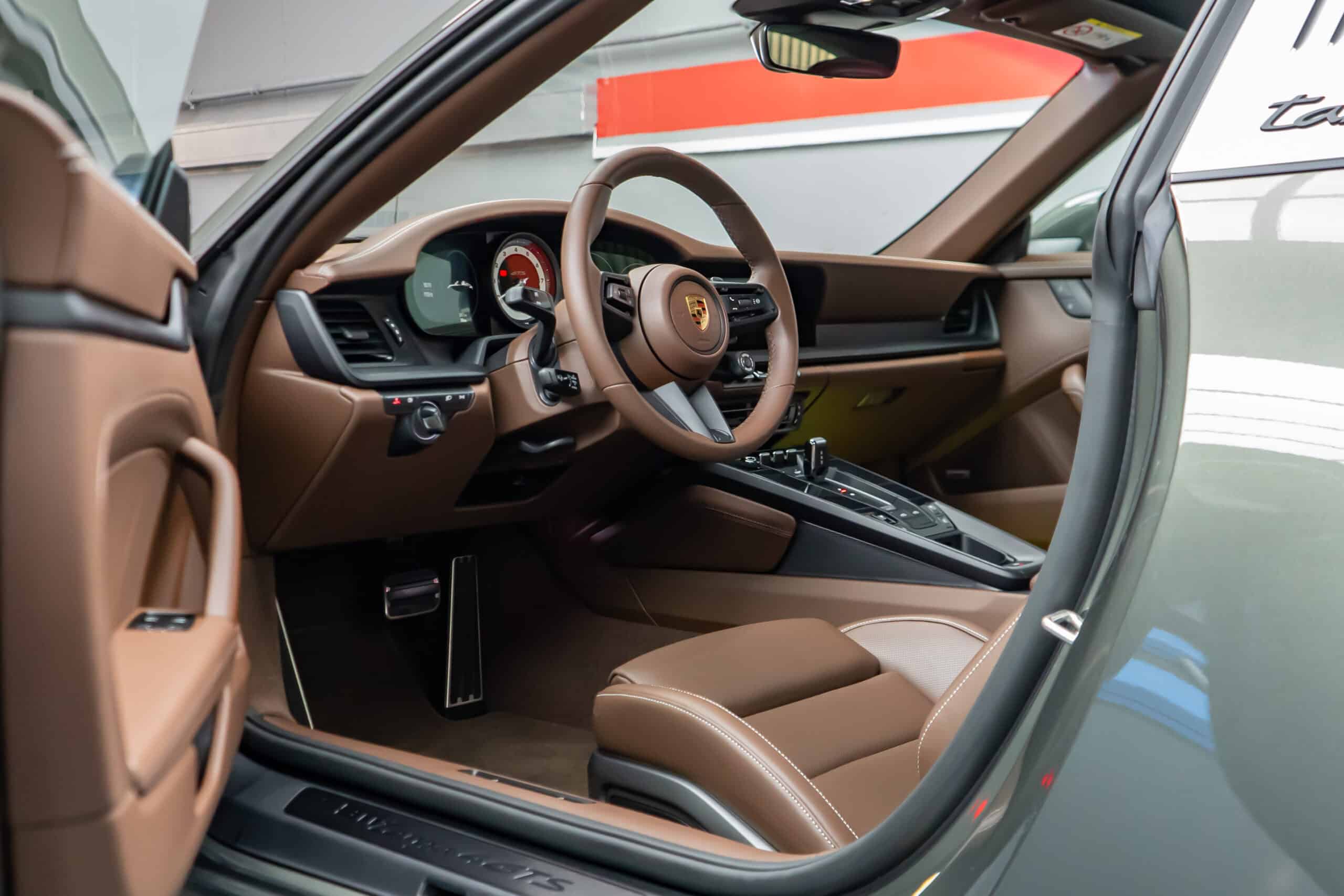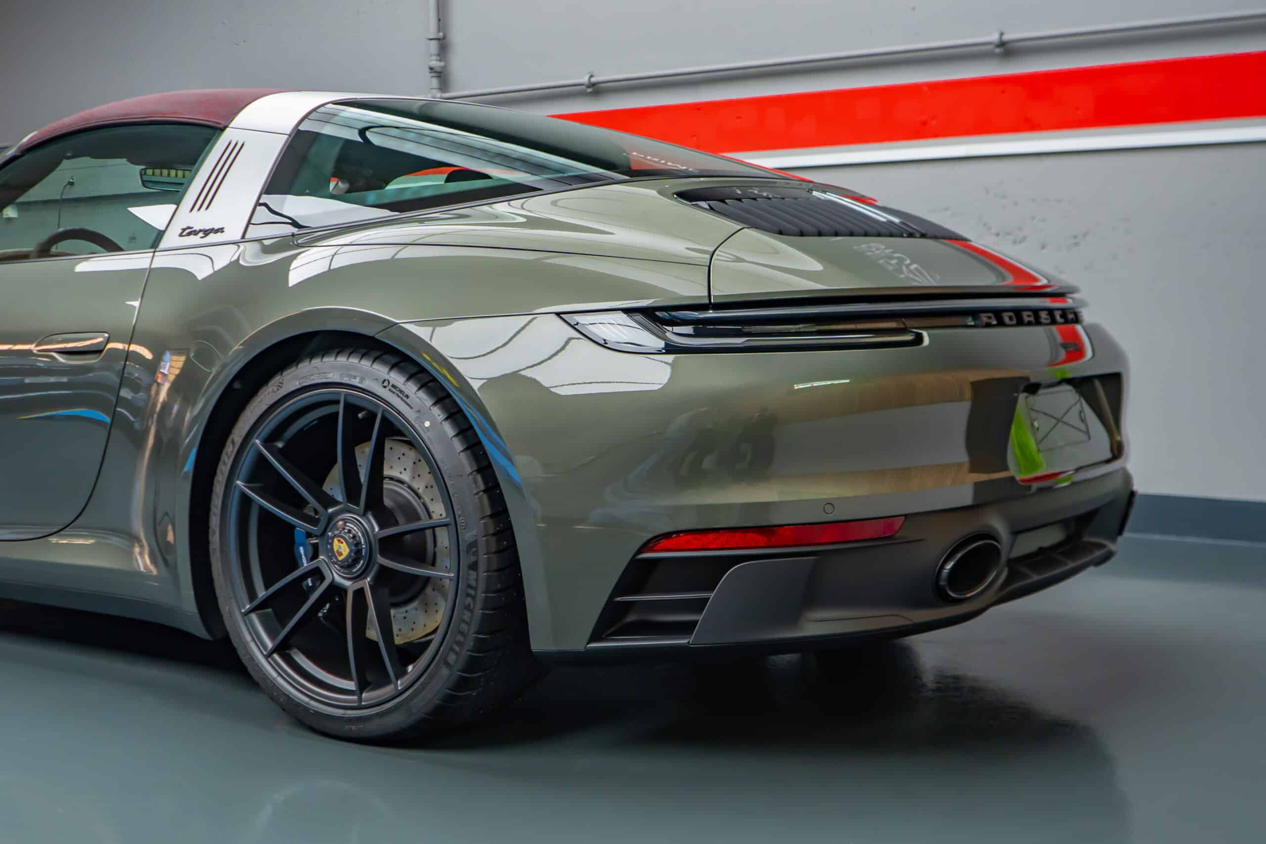 On this Beautiful Porsche 992 Taraga 4 GTS in Aventurin grün, the bumper, fenders, hood , original frontlip and side mirrors were protected with XPEL Ultimate Plus film. Unlike conventional paint protection films with a thickness of 120-150 µ, the Xpel Ultimate Plus with a thickness of 200 µ offers maximum impact and abrasion resistance. It is completely transparent and virtually invisible.