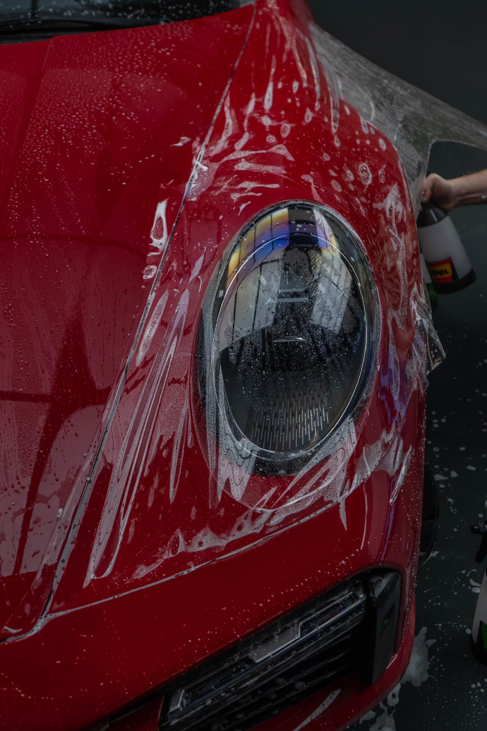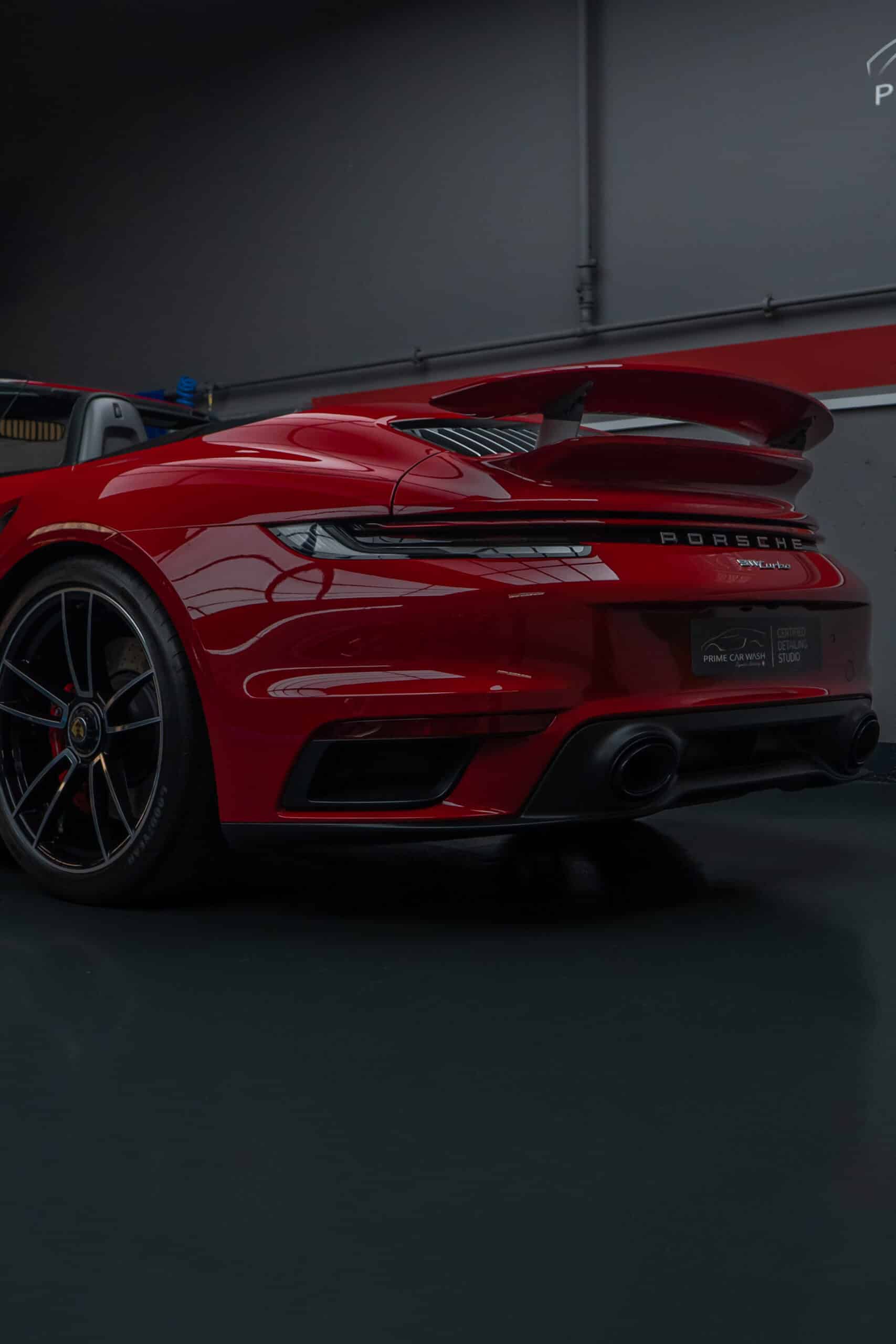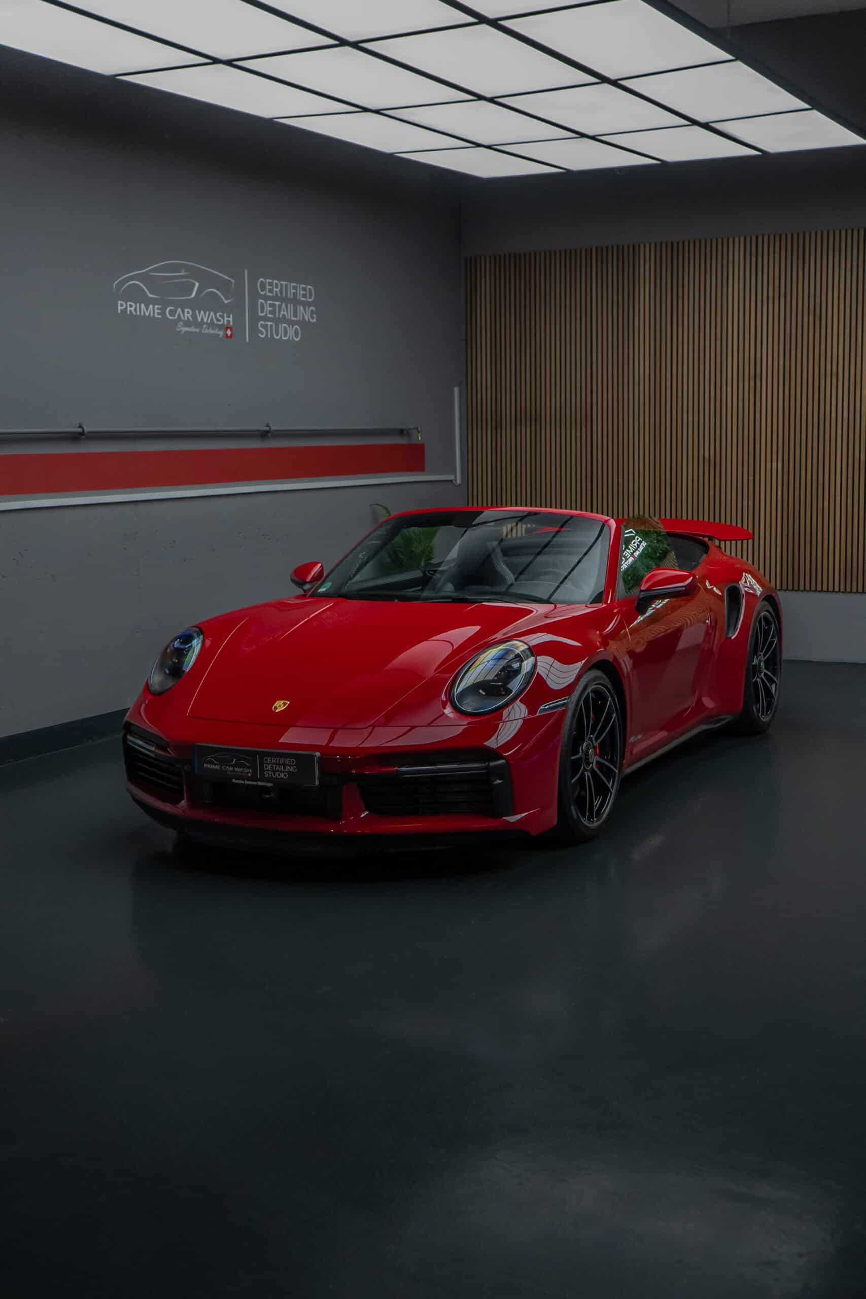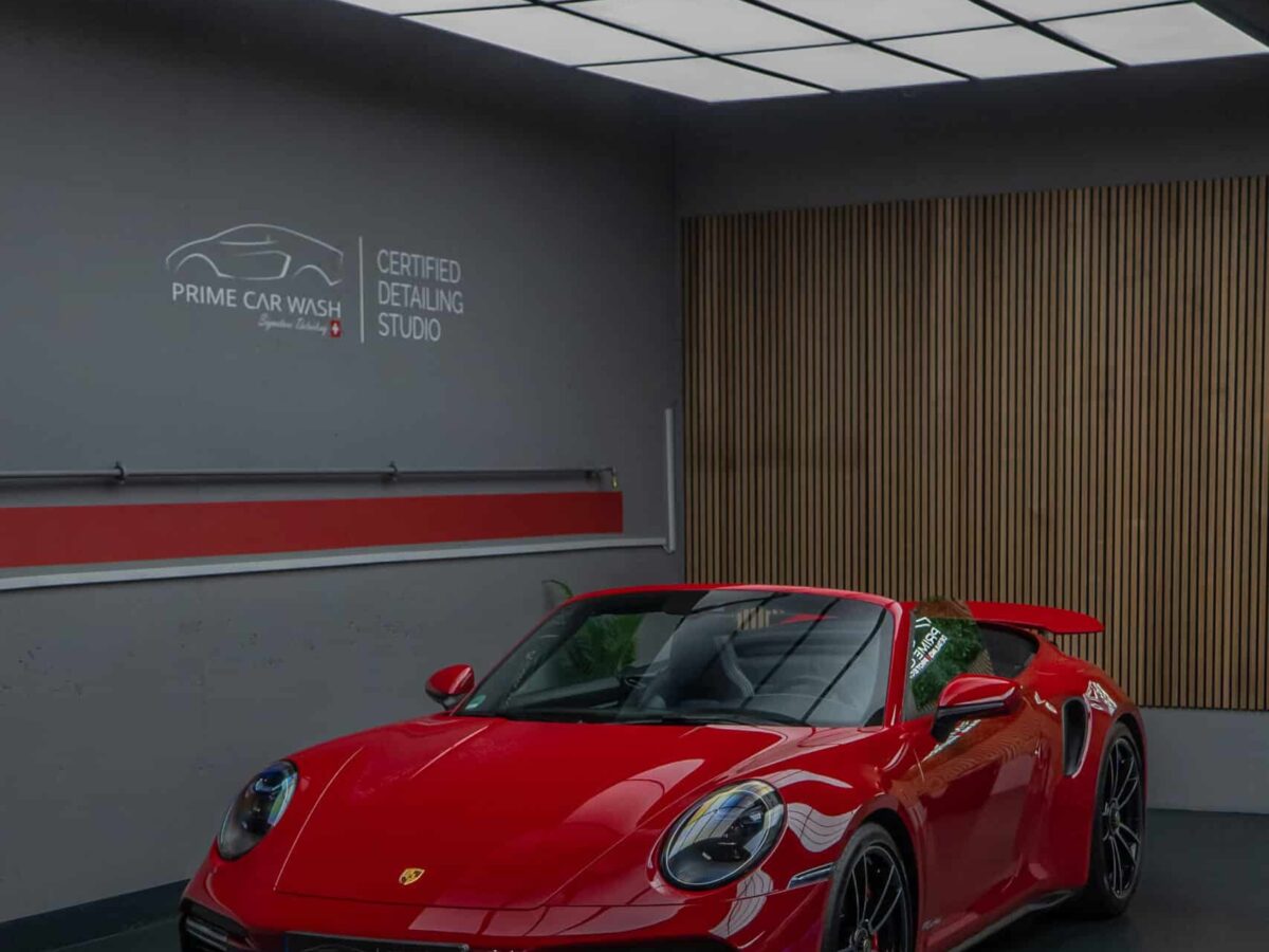 Dieser Porsche 992 Turbo in Karminrot ist purer Ikonen-Charakter. Um genau diese intensive Farbwirkung dauerhaft zu erhalten, haben wir den kompletten Wagen vollflächig mit unserer selbstheilenden Lackschutzfolie geschützt.