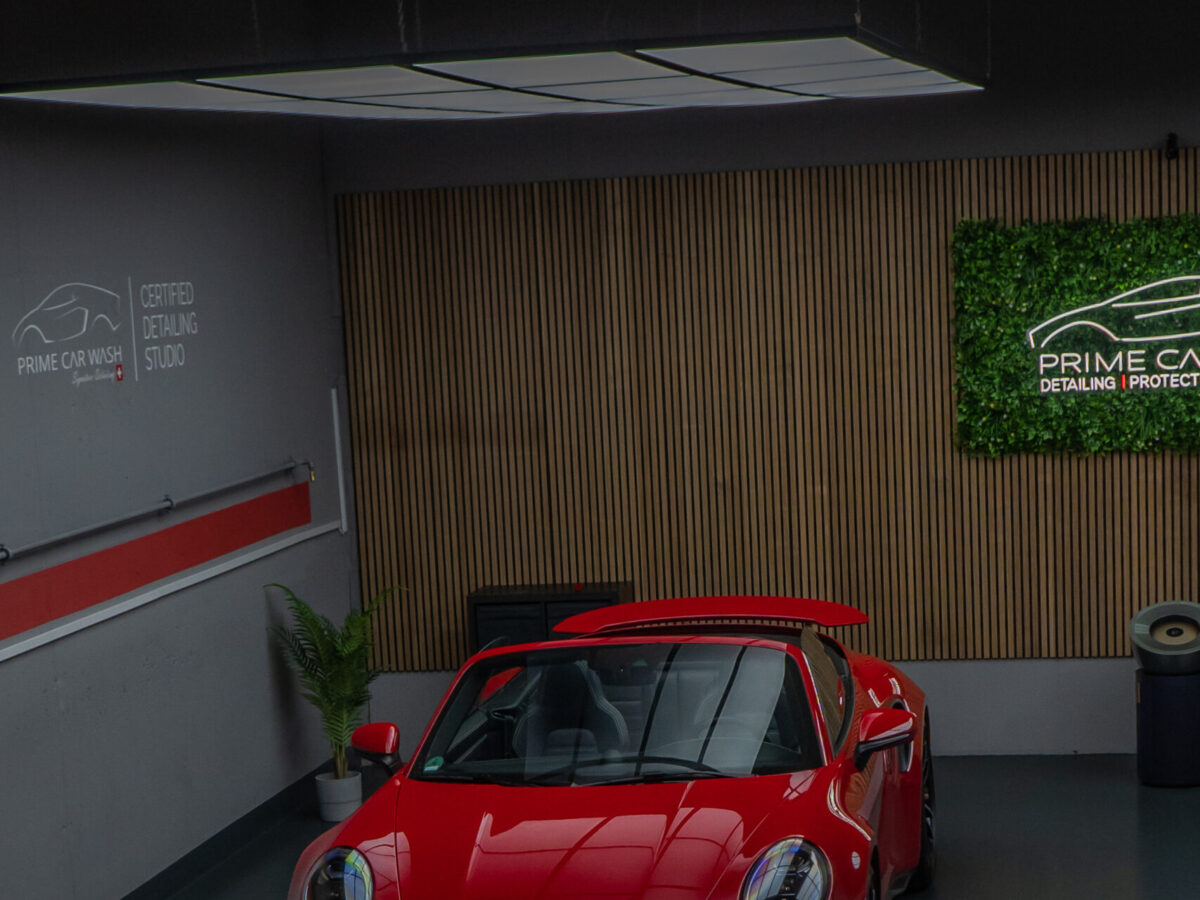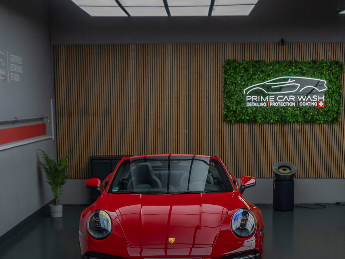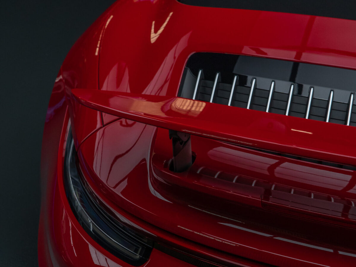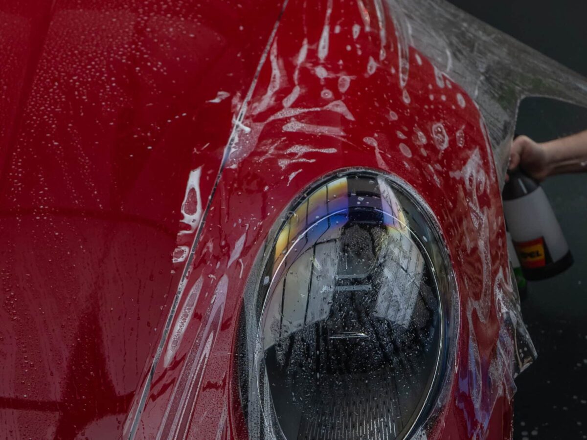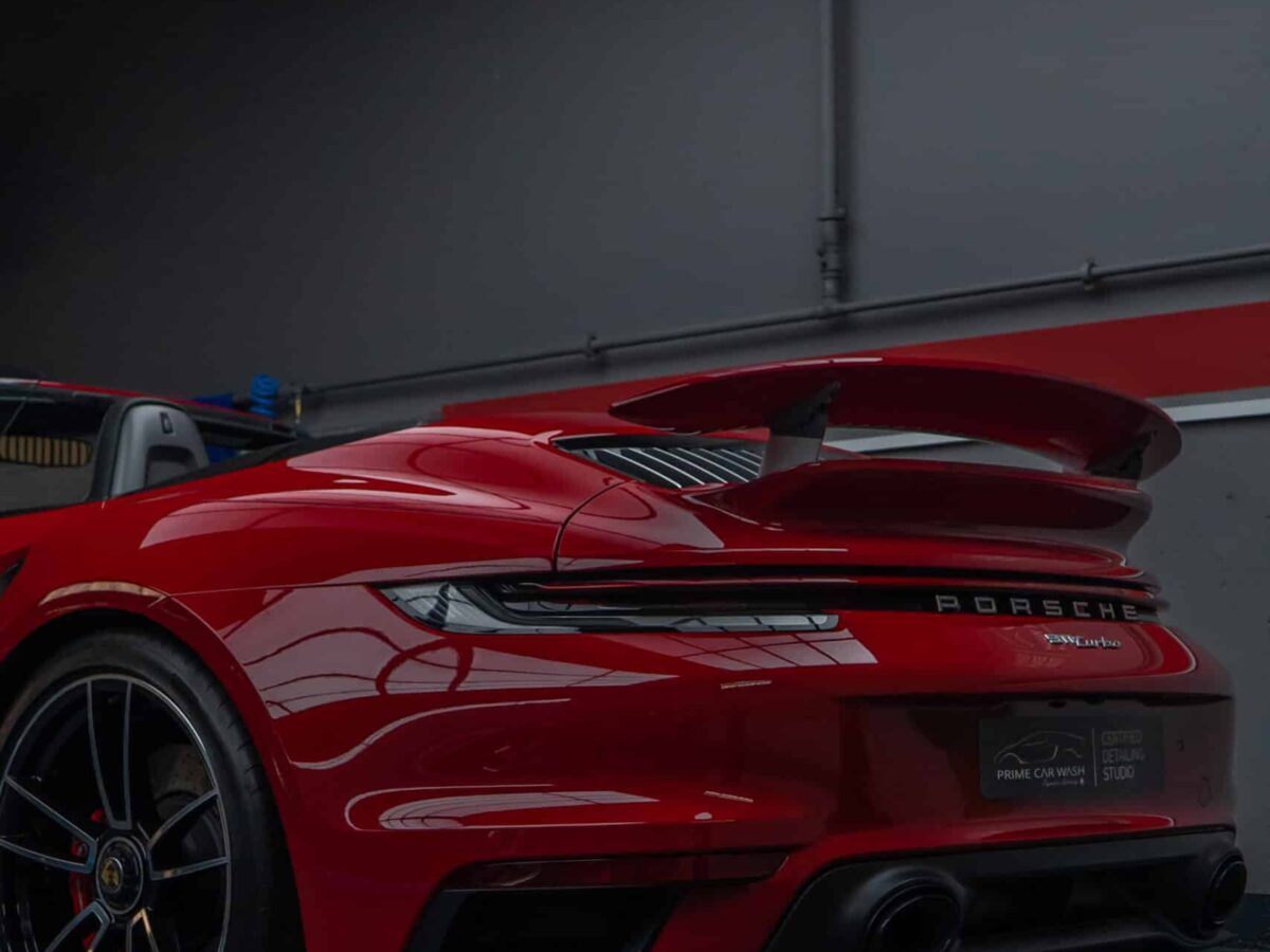 Dieser Porsche 992 Turbo in Karminrot ist purer Ikonen-Charakter. Um genau diese intensive Farbwirkung dauerhaft zu erhalten, haben wir den kompletten Wagen vollflächig mit unserer selbstheilenden Lackschutzfolie geschützt.