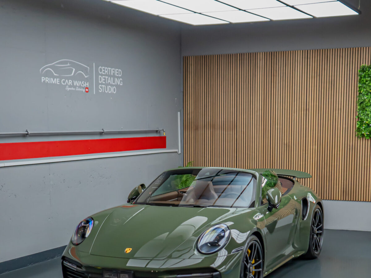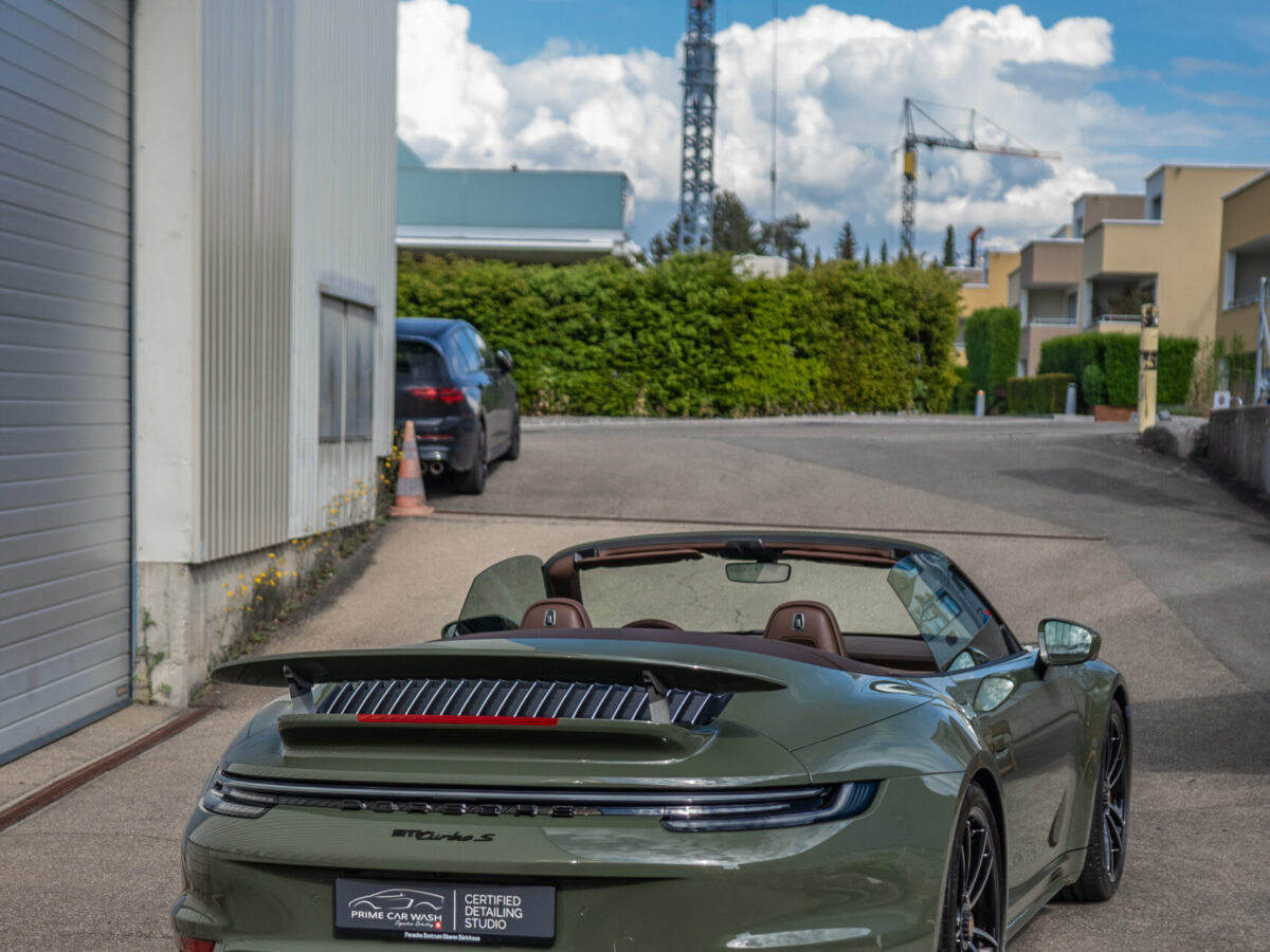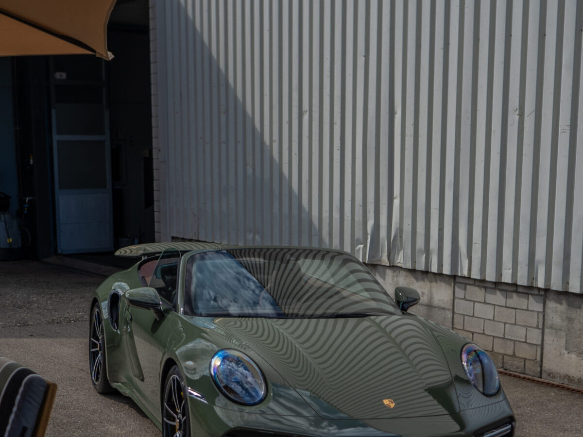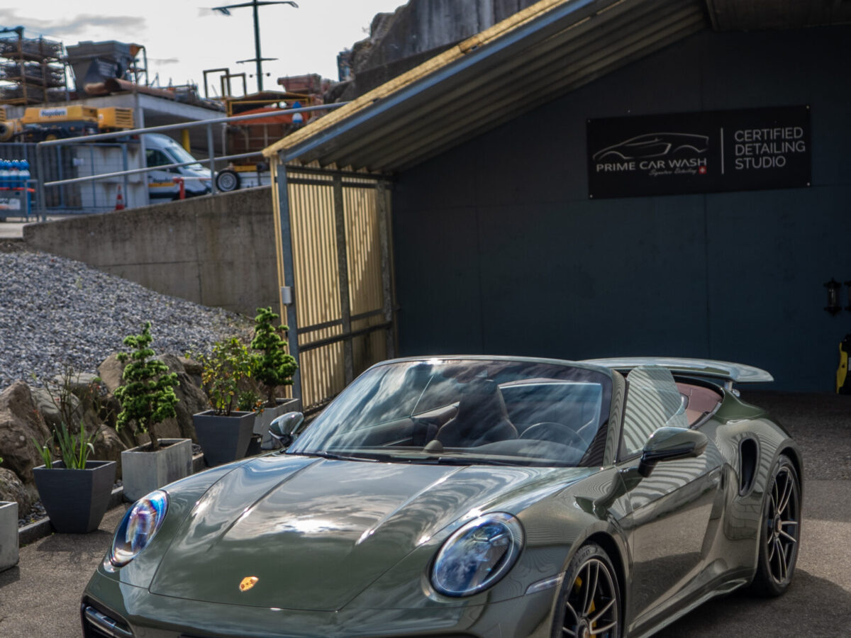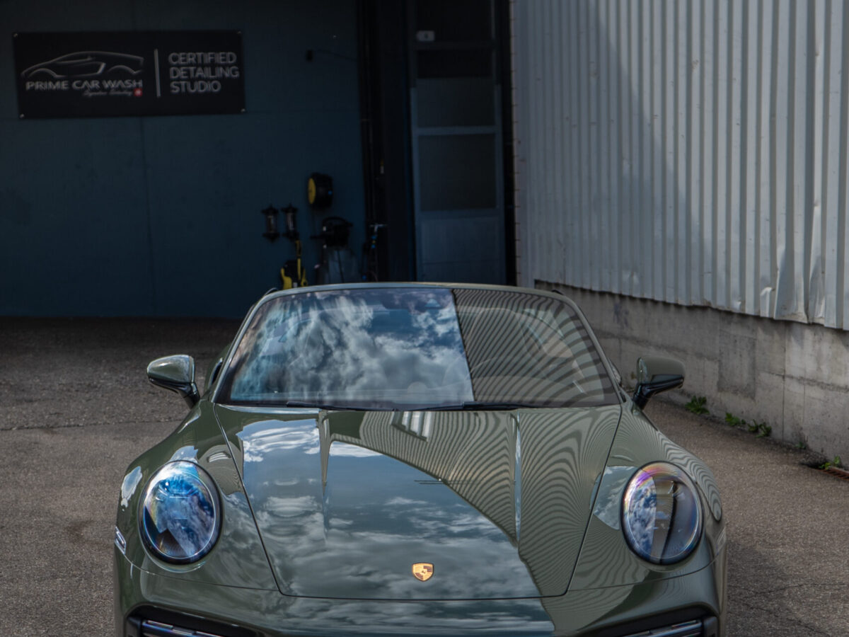 Diesen Porsche 992 Turbo S Cabrio mit der PTS Lackierung „Schwarz Olive“ haben wir mit der Selbstheilenden und höchst Transparenten Lackschutzfolie XPEL Ultimate Plus geschützt. Anschliessend wurden Lack, Frontscheibe sowie die Folie mit der XPEL FUSION Keramik beschichtet.