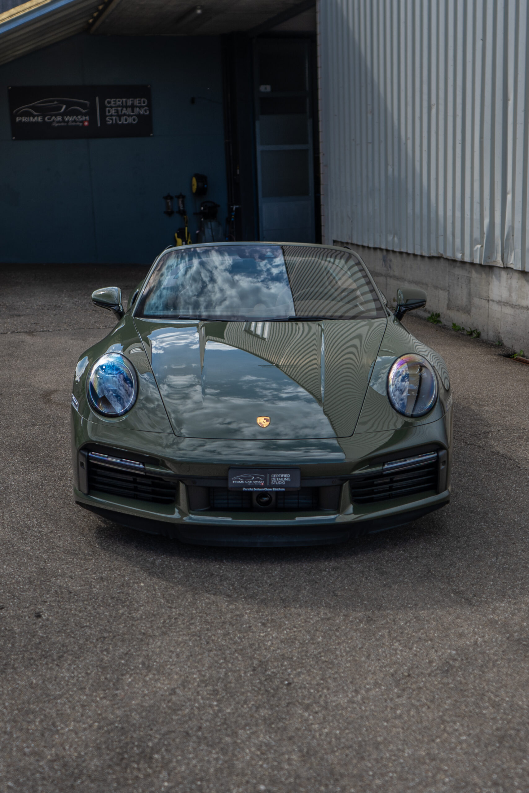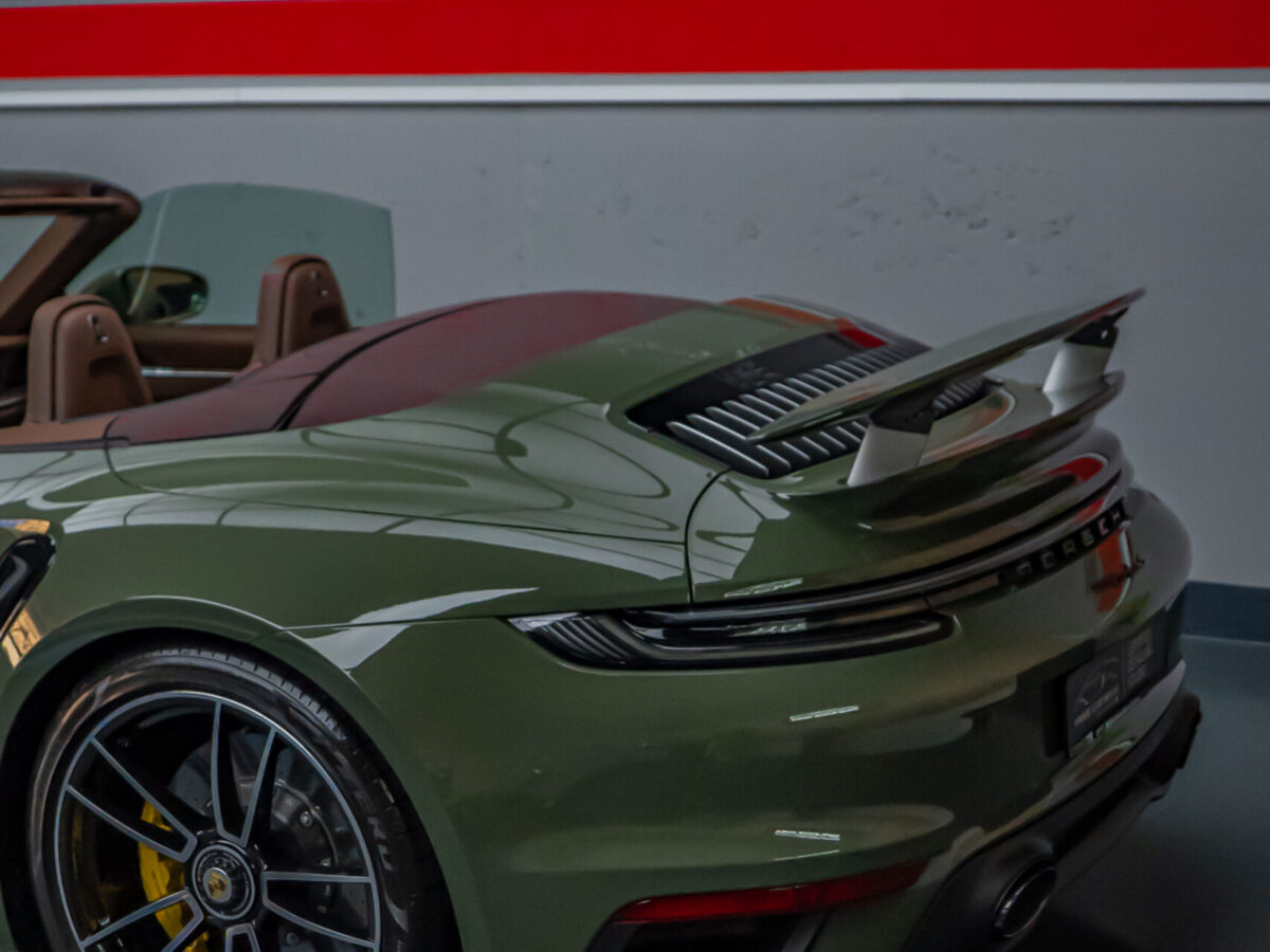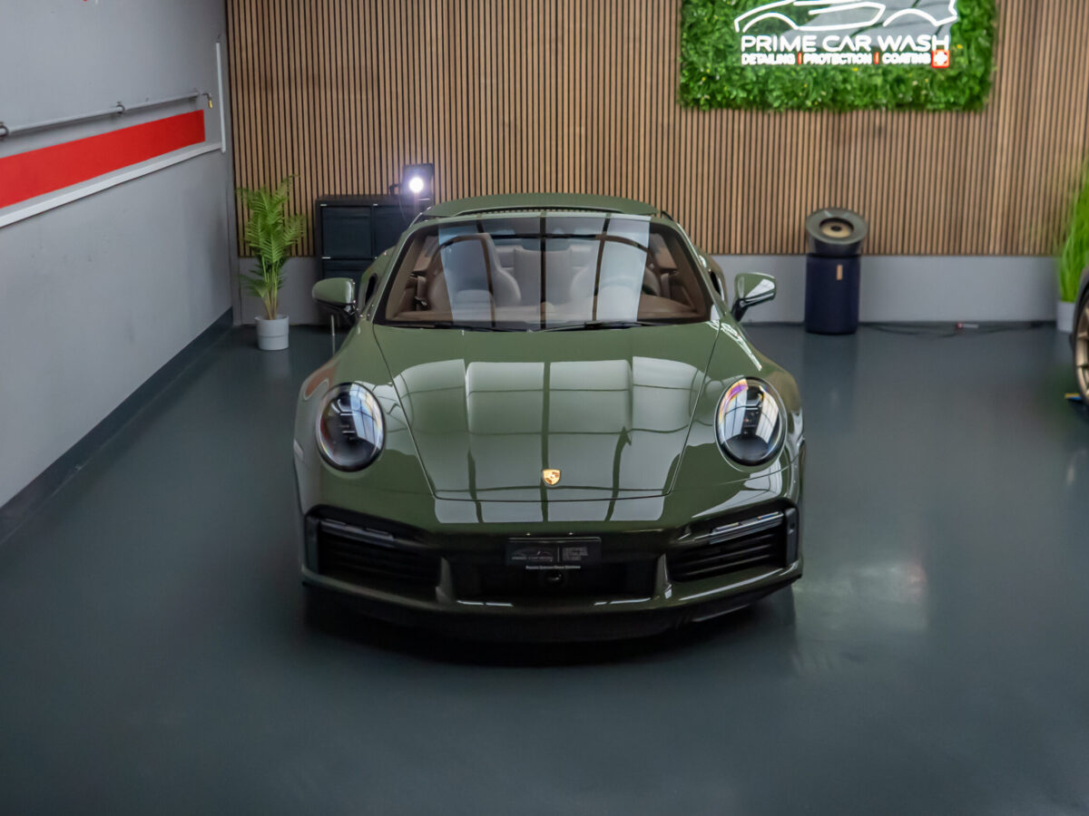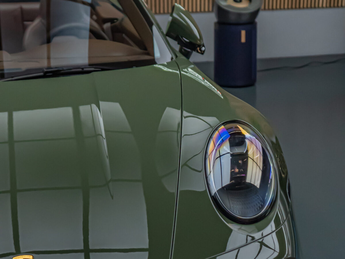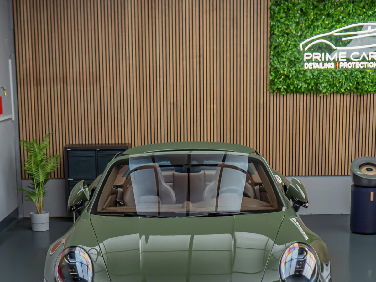 Diesen Porsche 992 Turbo S Cabrio mit der PTS Lackierung „Schwarz Olive“ haben wir mit der Selbstheilenden und höchst Transparenten Lackschutzfolie XPEL Ultimate Plus geschützt. Anschliessend wurden Lack, Frontscheibe sowie die Folie mit der XPEL FUSION Keramik beschichtet.
