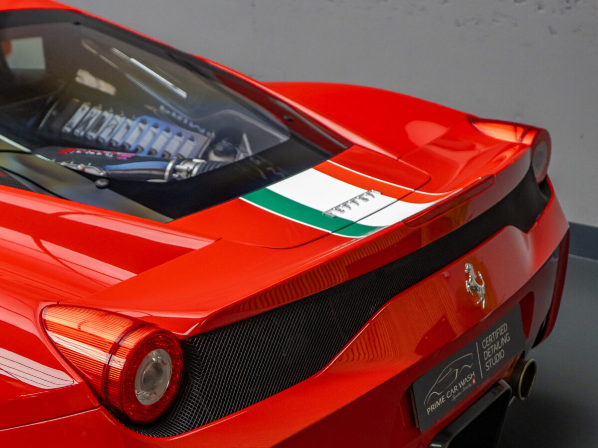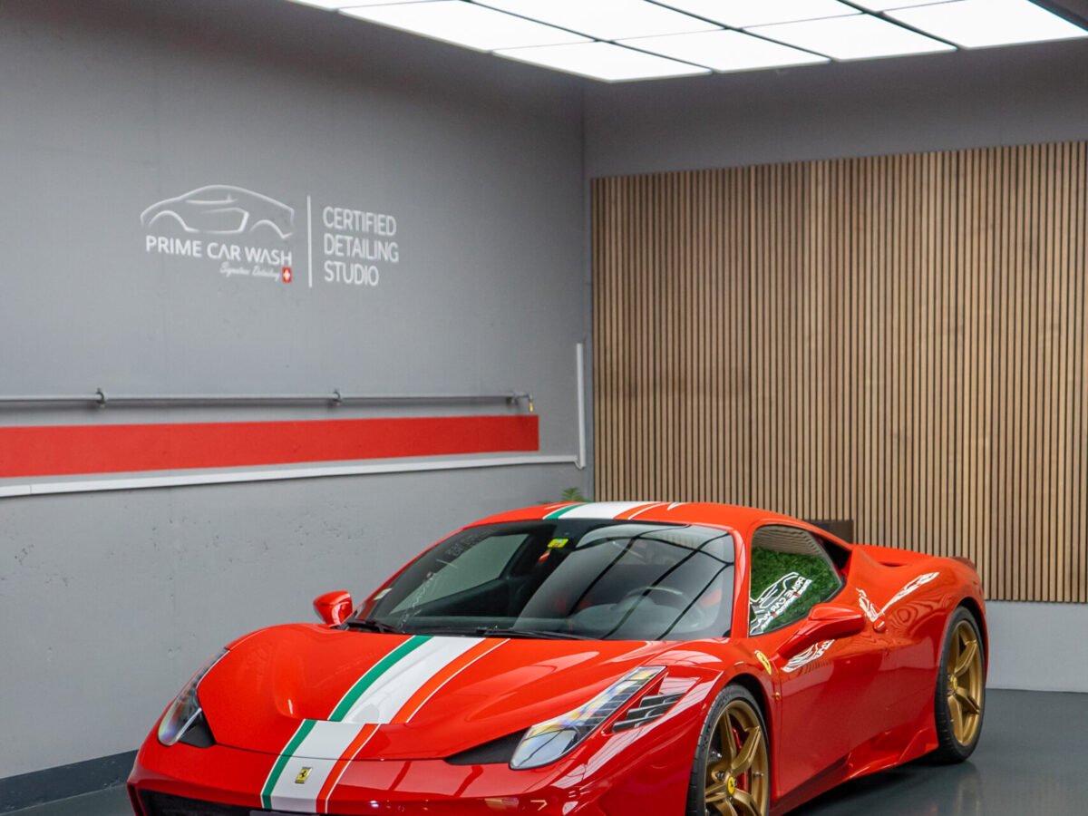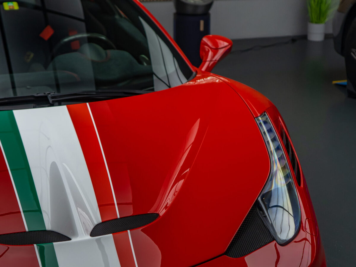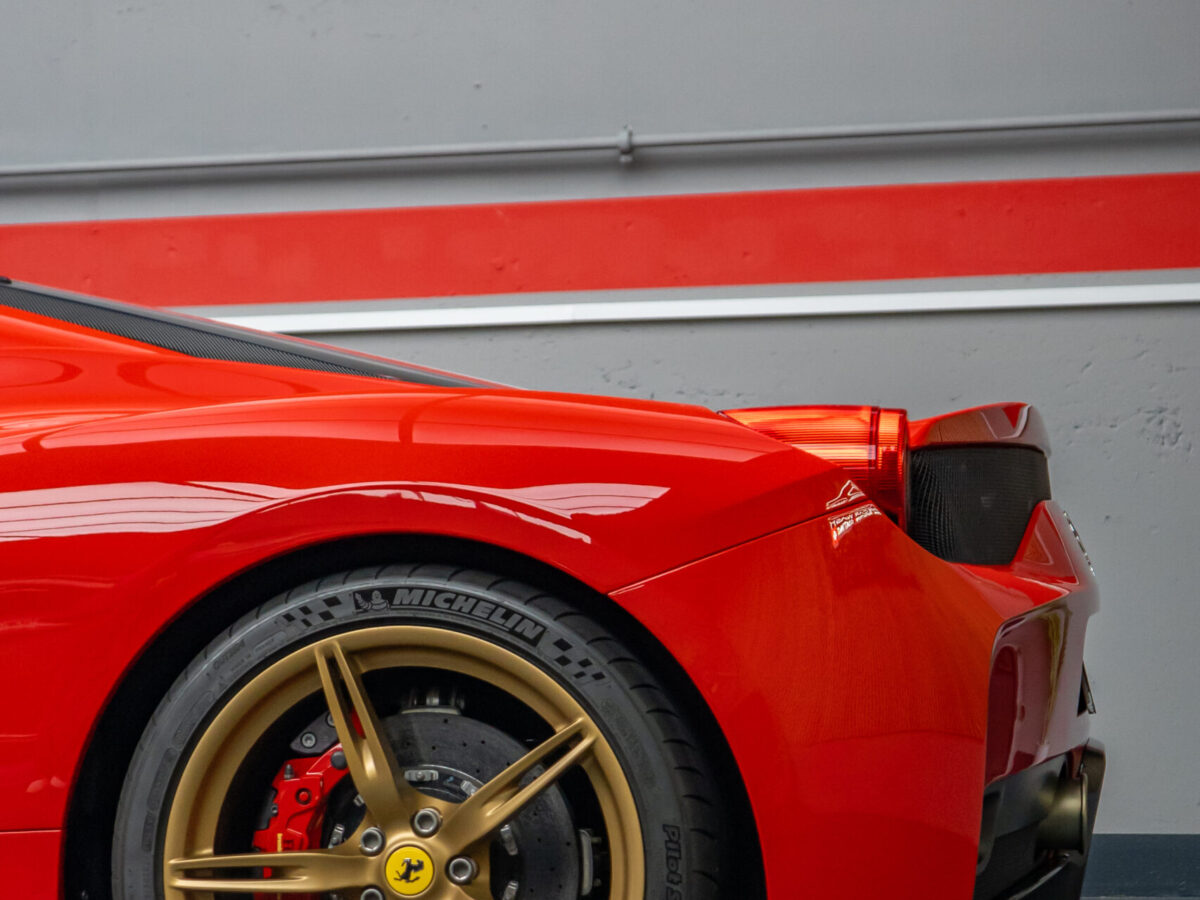 Diesen Ferrari 458 Speciale haben wir mit der Selbstheilenden und höchst Transparenten Lackschutzfolie XPEL Ultimate Plus geschützt.