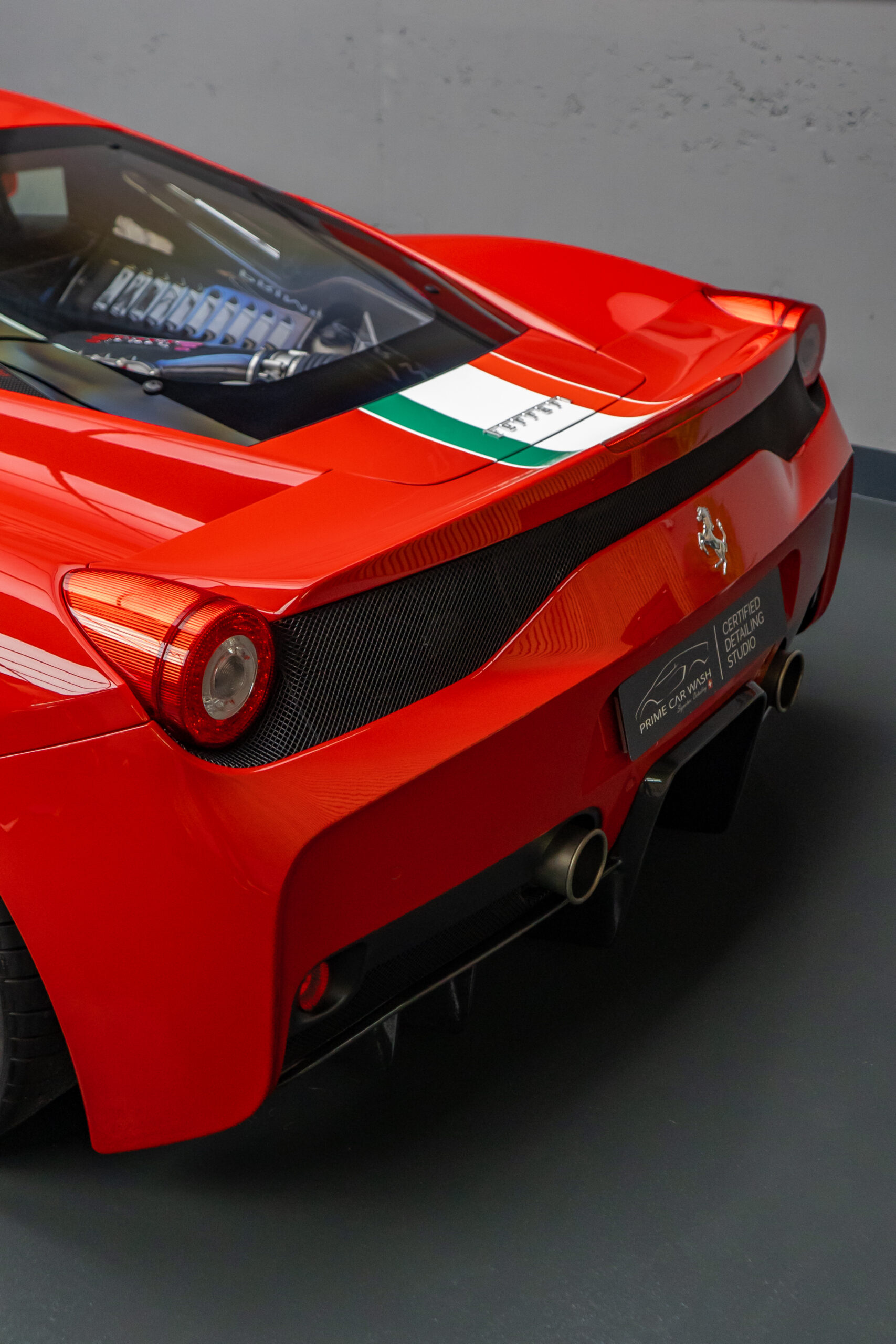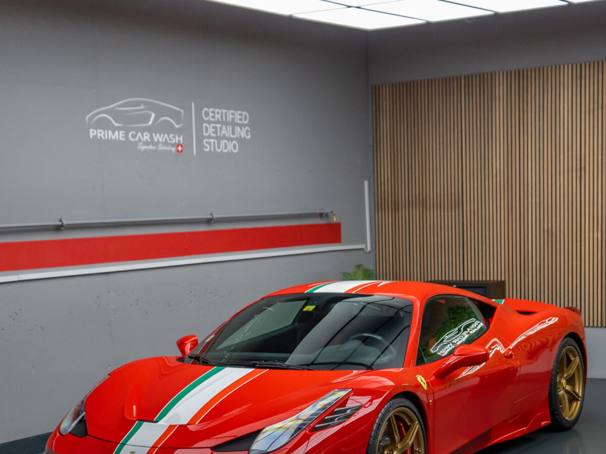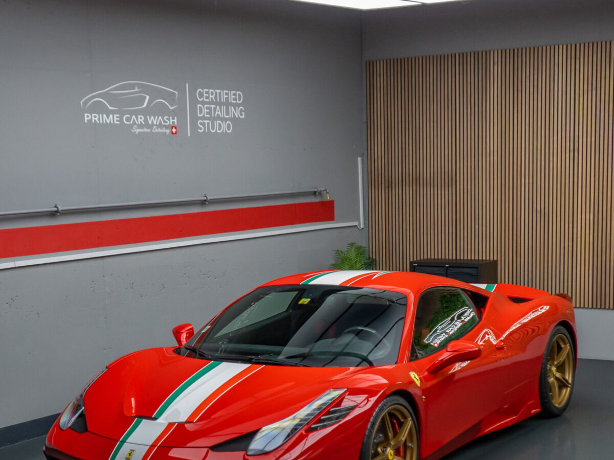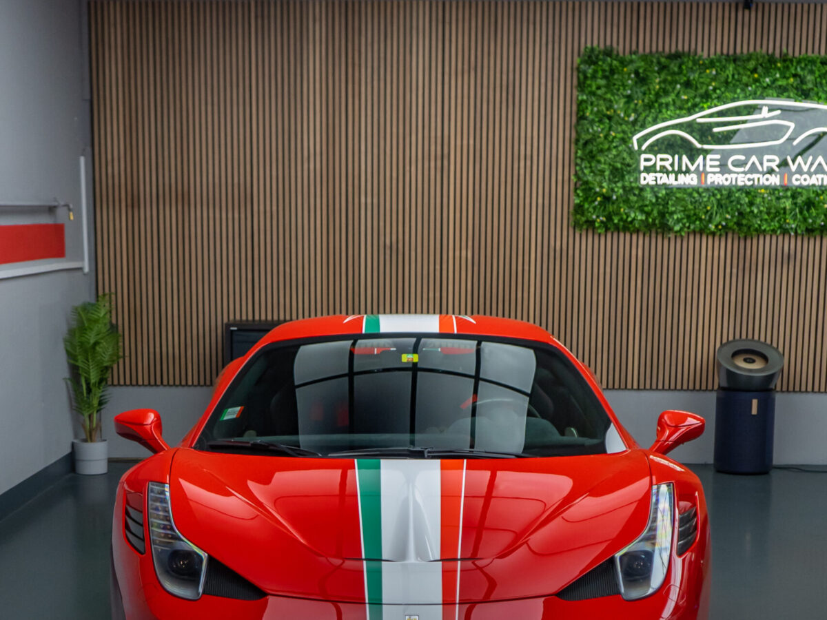 Diesen Ferrari 458 Speciale haben wir mit der Selbstheilenden und höchst Transparenten Lackschutzfolie XPEL Ultimate Plus geschützt.