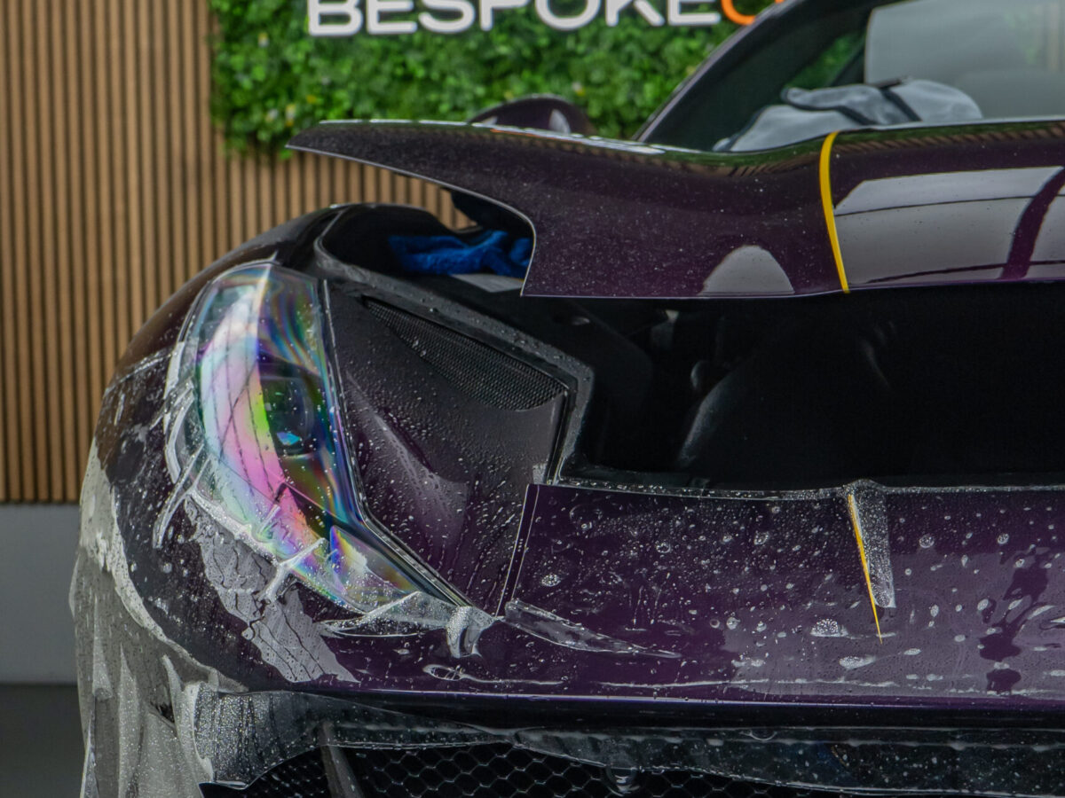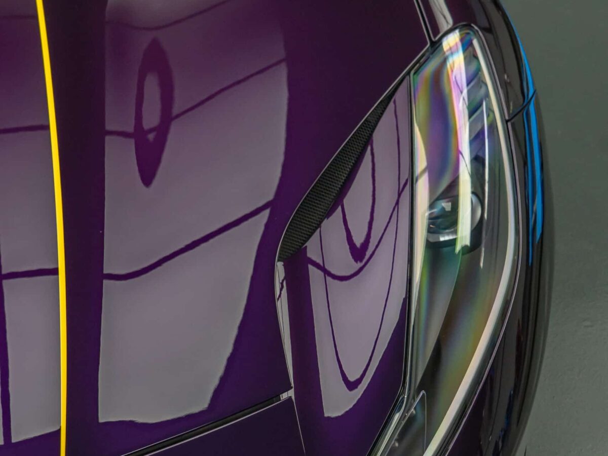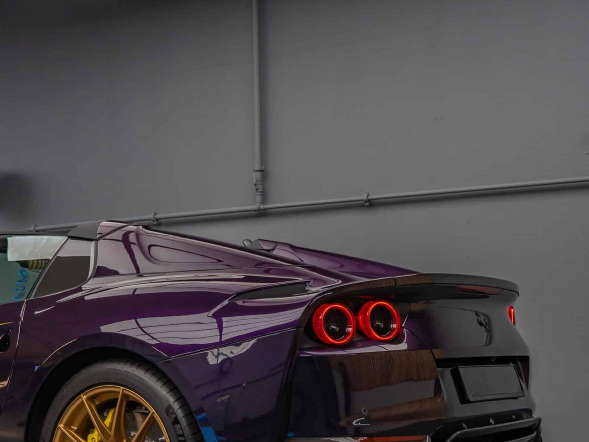 Die glasklare, selbstheilende Folie schützt den exklusiven Viola Hongkong Lack zuverlässig vor Steinschlägen, Kratzern, Insektenresten und Umwelteinflüssen – ohne das originale Finish zu verändern. Jede Linie, jede Kante des 812 GTS wurde mit höchster Präzision foliert. Besonders die komplexen Konturen im Frontbereich und an den markanten Seitenschwellern erforderten filigrane Handarbeit, um eine nahezu unsichtbare Optik und kompromisslosen Werterhalt zu gewährleisten.
