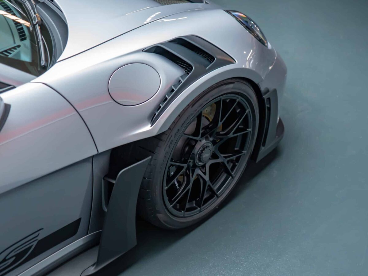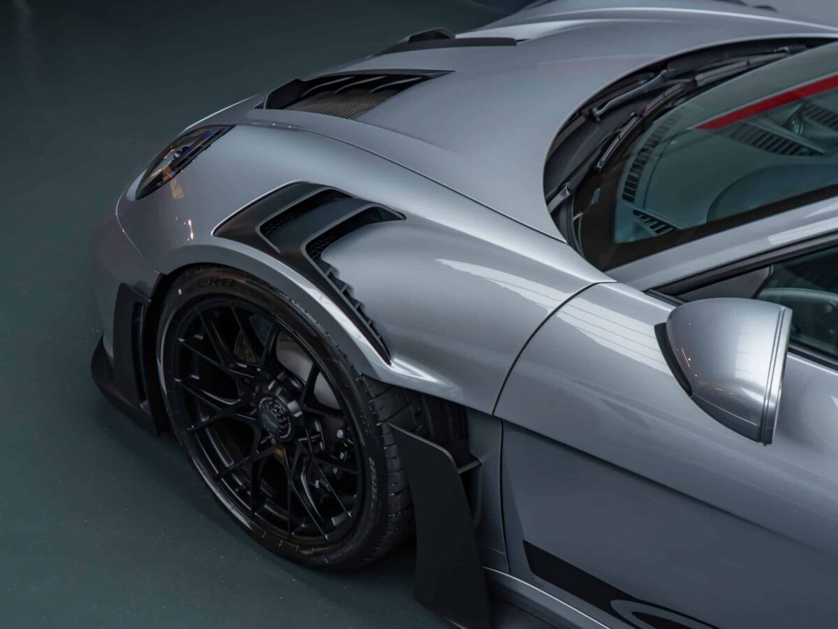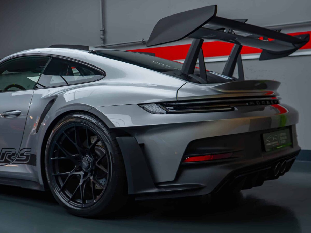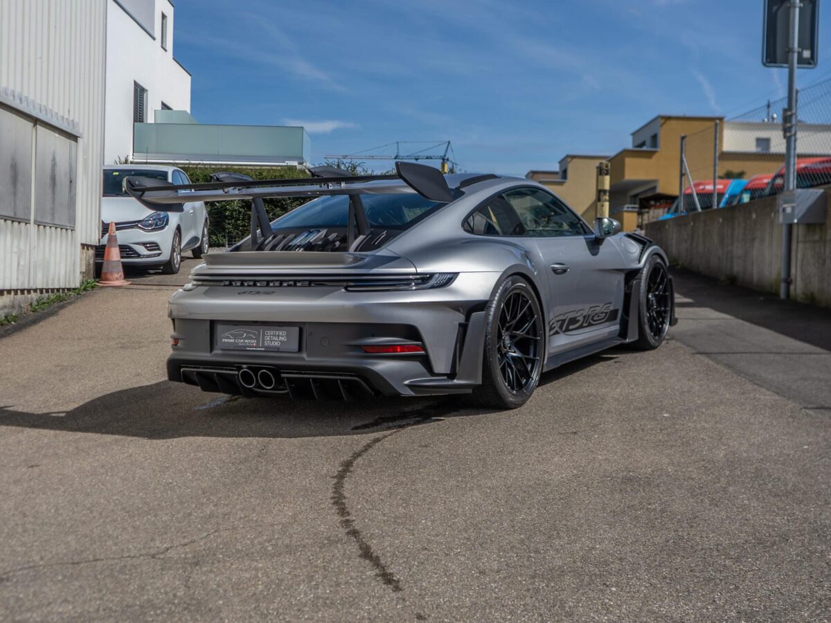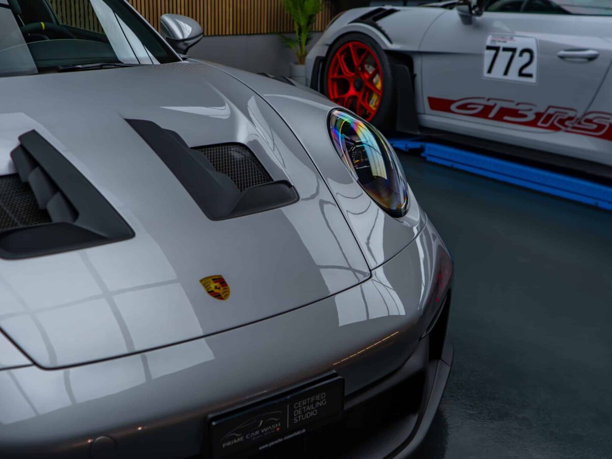 On this Beautiful Porsche 992 GT3 RS in GT-Silver, the bumper, fenders, hood and side mirrors were protected with XPEL Ultimate Plus film. Unlike conventional paint protection films with a thickness of 120-150 µ, the Xpel Ultimate Plus with a thickness of 200 µ offers maximum impact and abrasion resistance. It is completely transparent and virtually invisible.