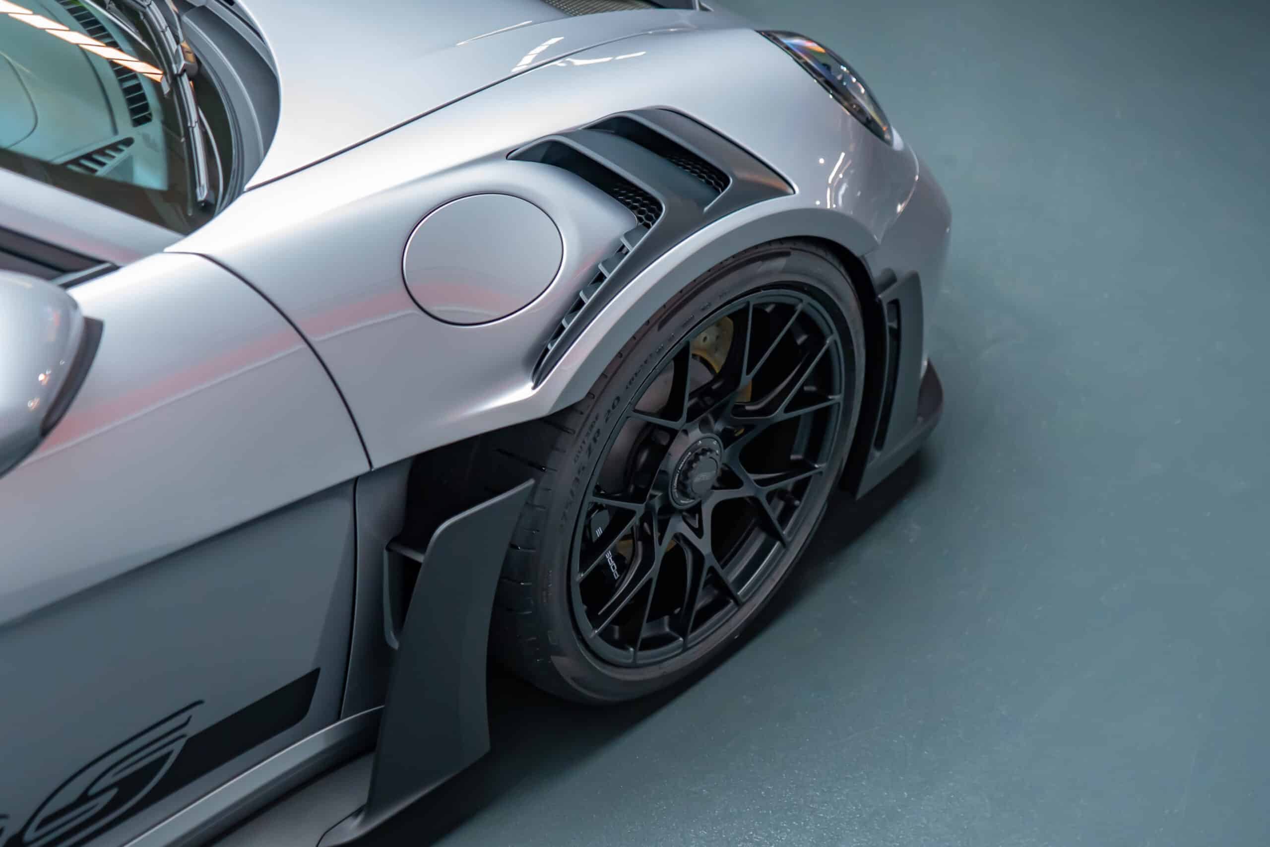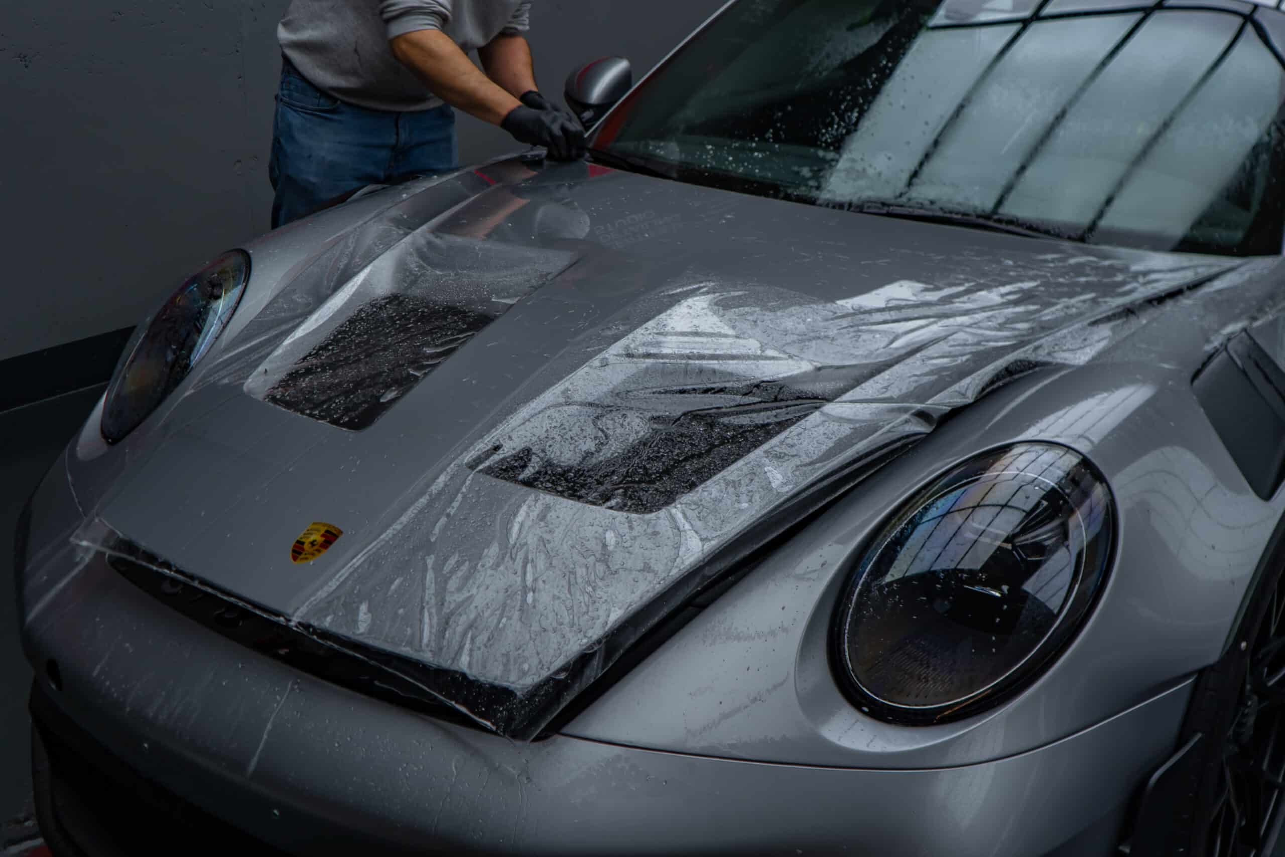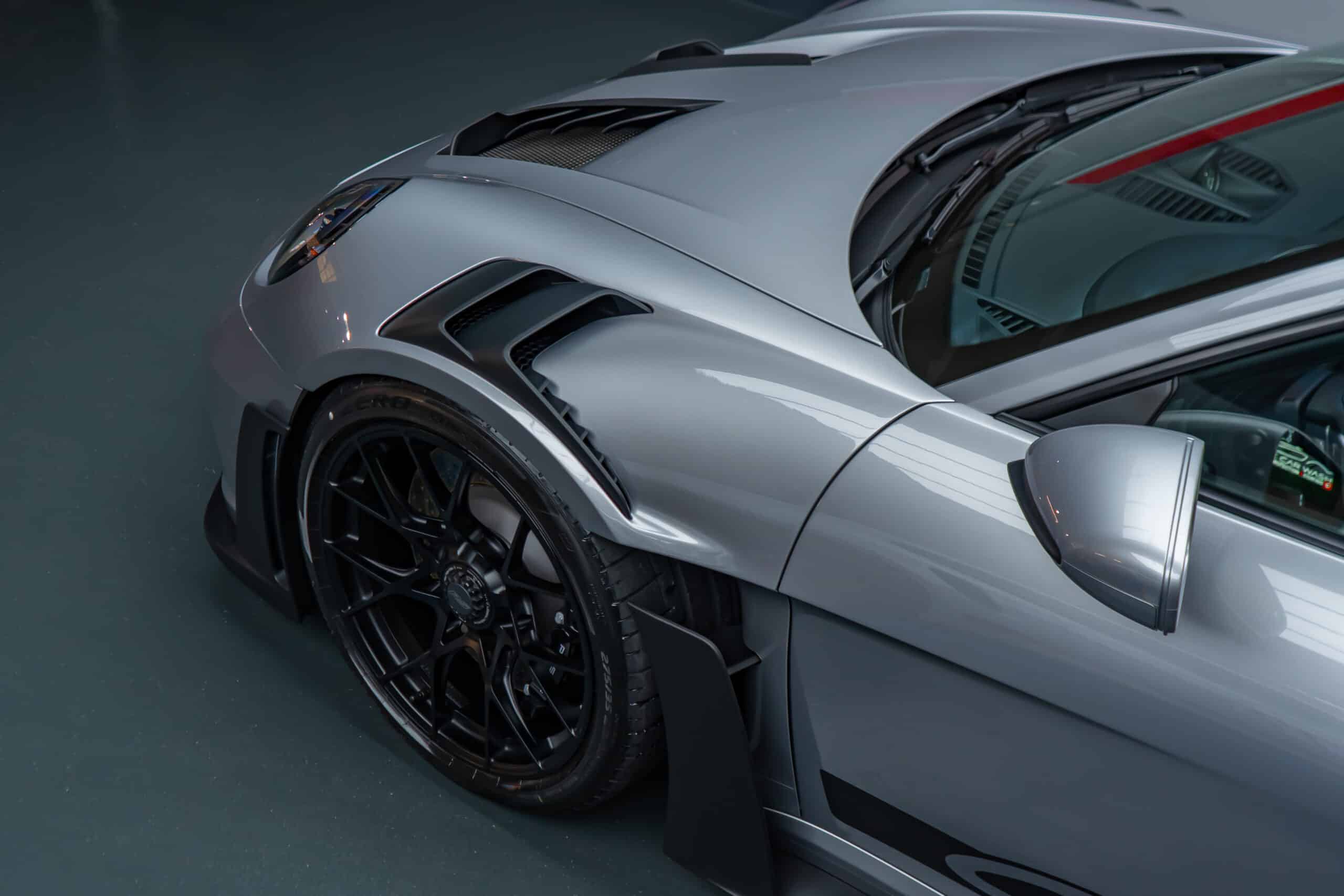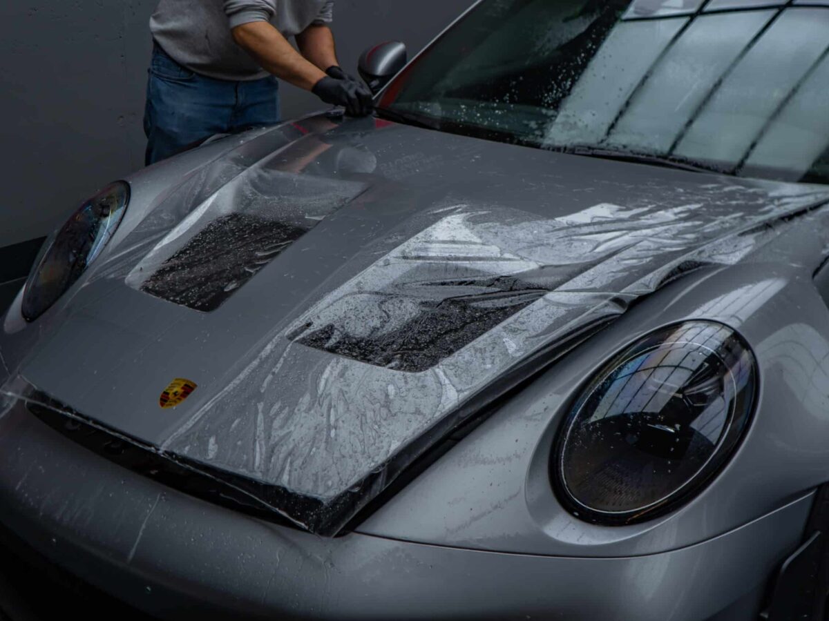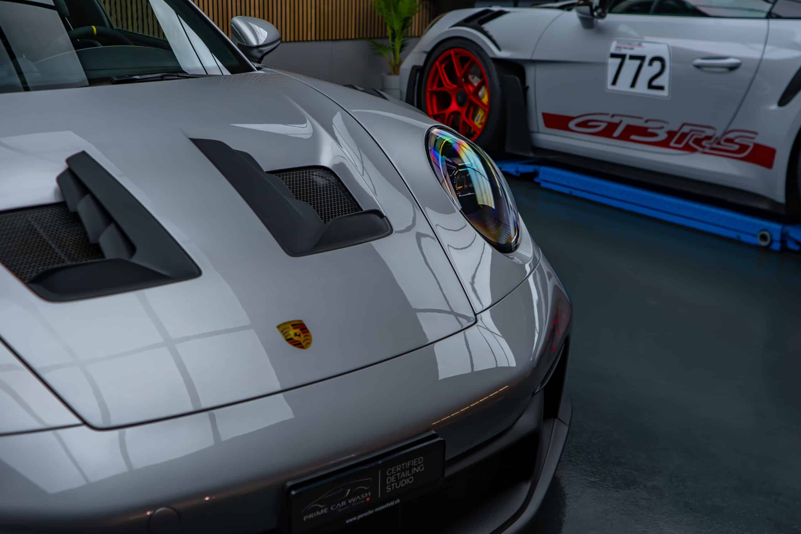 On this Beautiful Porsche 992 GT3 RS in GT-Silver, the bumper, fenders, hood and side mirrors were protected with XPEL Ultimate Plus film. Unlike conventional paint protection films with a thickness of 120-150 µ, the Xpel Ultimate Plus with a thickness of 200 µ offers maximum impact and abrasion resistance. It is completely transparent and virtually invisible.