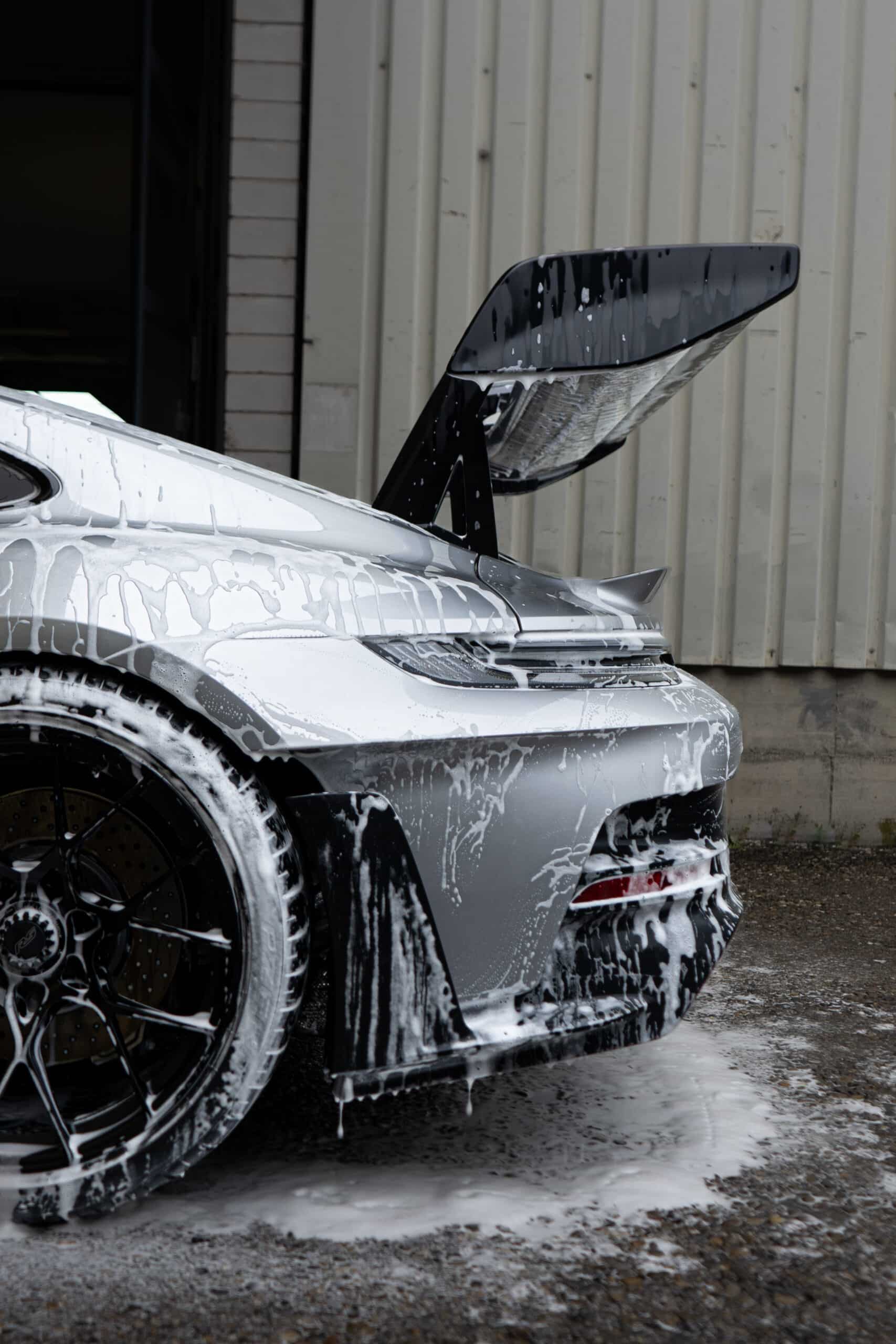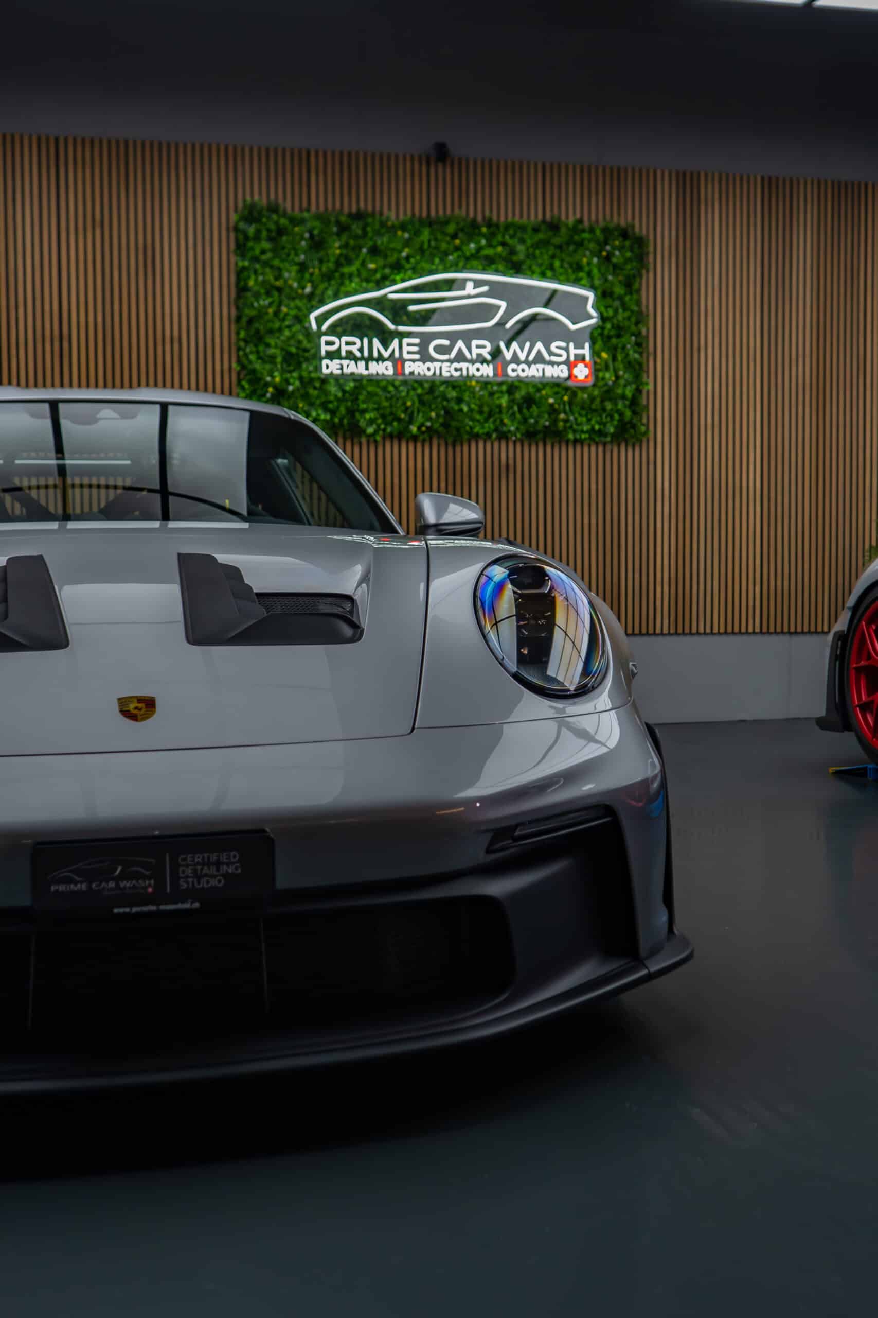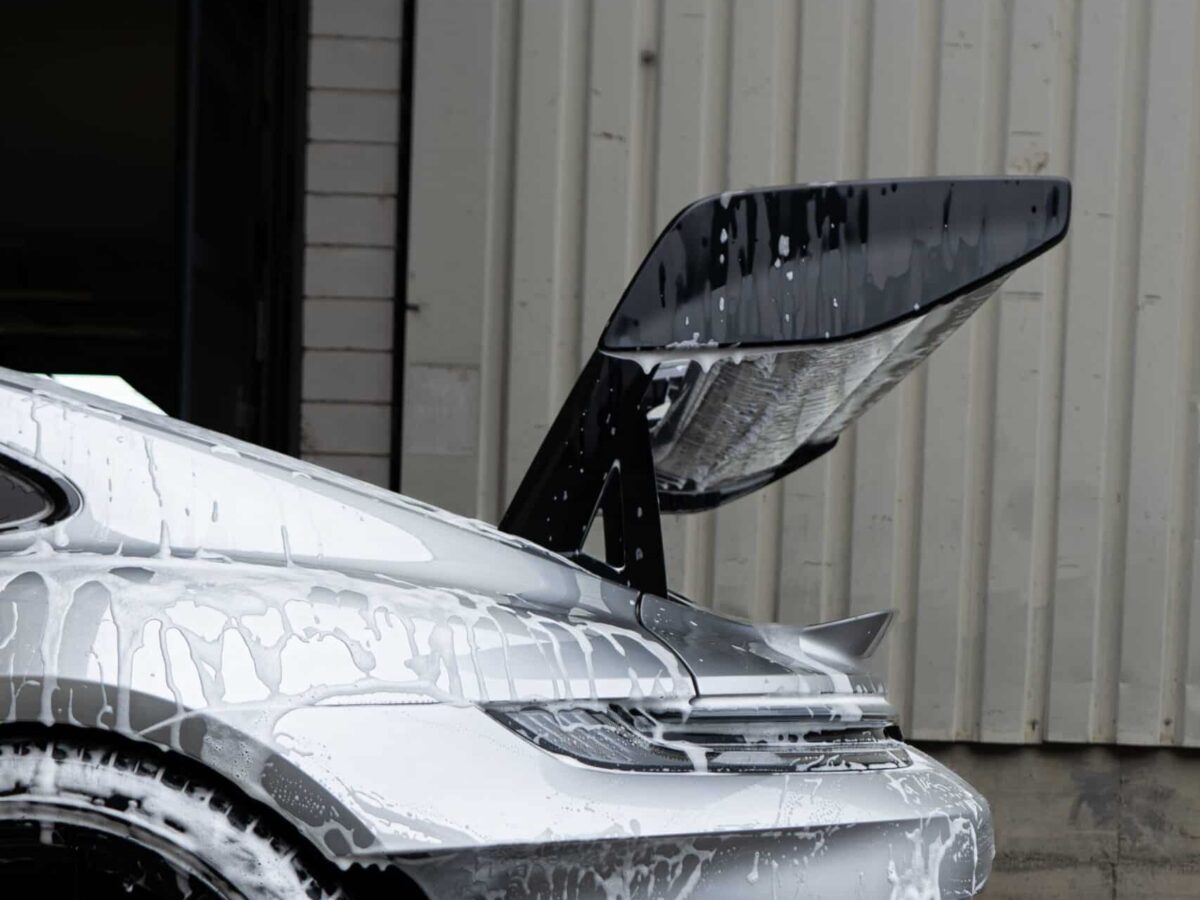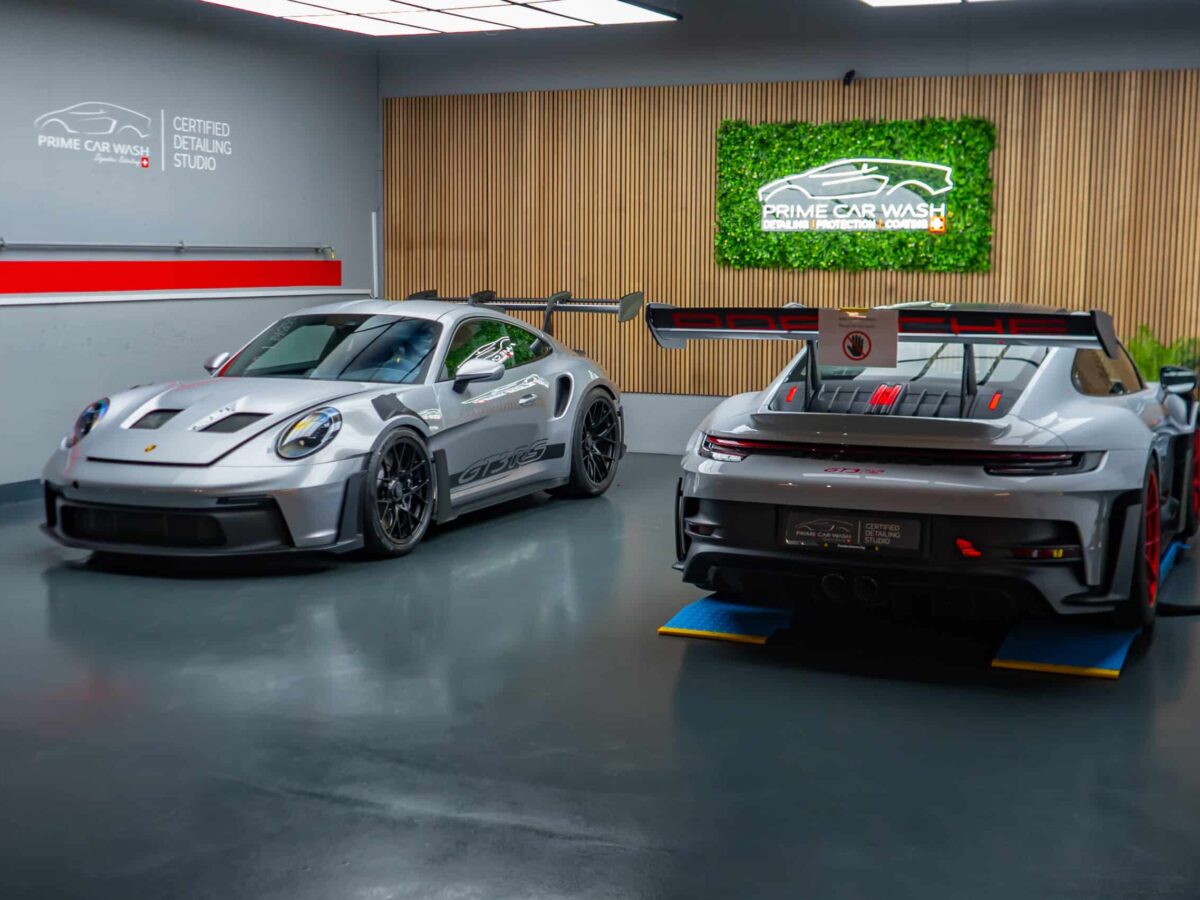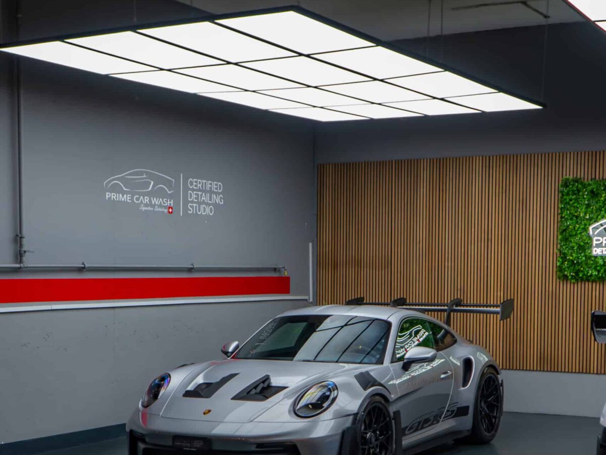 On this Beautiful Porsche 992 GT3 RS in GT-Silver, the bumper, fenders, hood and side mirrors were protected with XPEL Ultimate Plus film. Unlike conventional paint protection films with a thickness of 120-150 µ, the Xpel Ultimate Plus with a thickness of 200 µ offers maximum impact and abrasion resistance. It is completely transparent and virtually invisible.